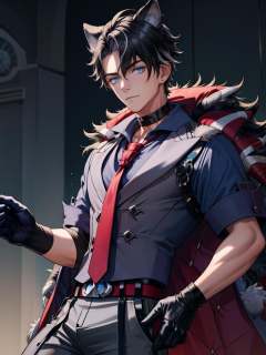 1boy,, masterpiece,best quality, <lora:Wriothesley:1>,handsome,animal ears,black hair,short hair,blue eyes,choker,red necktie,short sleeves,black gloves,shirt,coat,belt,grey pants,fur trim