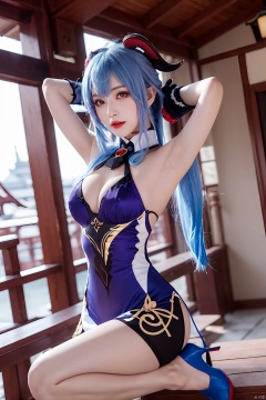 1girl, ganyu (genshin impact), horns, solo, blue hair, detached sleeves, gloves, breasts, ahoge, bell, looking at viewer, armpits, high heels, black gloves, arms up, long hair, sitting, bangs, cowbell, architecture, vision (genshin impact), medium breasts, goat horns, neck bell, purple eyes