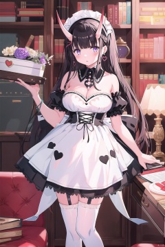 nengdai,1girl, horns, breasts, oni horns, solo, purple eyes, maid headdress, official alternate costume, thighhighs, apron, white apron, dress, cleavage, looking at viewer,standing, plant, black thighhighs, black hair, maid apron, maid, large breasts, black dress, long hair, bare shoulders, detached collar, strapless, strapless dress, indoors, menu, bangs, black garter straps, potted plant, book, x hair ornament, jewelry, medium breasts, heart, wooden floor, couch, lips, garter straps, collar, feet out of frame, white dress, flower, skirt, chair, black skirt, frills, bracelet, horn ornament, earrings, bookshelf, hand on own thigh, frilled apron, waist apron, white collar, short dress, zettai ryouiki, blunt bangs