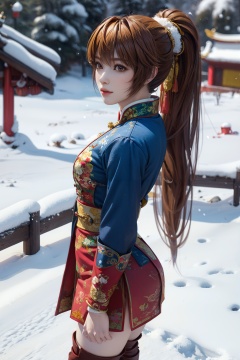 masterpiece,high quality,kasumi,brown eyes,1girl,solo,looking_at_viewer,<lora:add_detail:0.3>,3D graphics,brown hair,ponytail,white thighhighs,simple background,outdoors,(snow),snowflakes,<lora:kasumi-000003:0.7>,chinese clothes,china dress,new year,