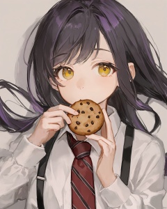 1girl,affinity_line,black_hair,collared_shirt,commentary,cookie,dress_shirt,eating,eleanor_(affinity_line),food,hair_over_shoulder,highres,holding,holding_cookie,holding_food,long_hair,long_sleeves,looking_at_viewer,multicolored_hair,necktie,plaid_necktie,purple_hair,red_necktie,shirt,sho_(sho_lwlw),solo,streaked_hair,suspenders,symbol-only_commentary,tie_clip,upper_body,white_shirt,yellow_eyes