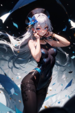 tutututu, black one-piece swimsuit, collar, navel, black pantyhose, -1girl, blue eyes, solo, long hair, blue nails, looking at viewer, white hair, flower, jewelry, floating hair, nail polish, ring, hat, hair ornament, bare shoulders, breasts, white nails, bangs, hair between eyes, hands on own face,White hell, <lora:add_detail:0.2>