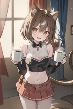 detailed eyes, 1girl, animal ears, cup, brown hair, skirt, navel, tail, mug, looking at viewer, cat ears, smile, holding, midriff, breasts, brown eyes, cat tail, holding cup, open mouth, coffee, short hair, pleated skirt, coffee mug, window, cat girl, belt, crop top, animal ear fluff, pouch, :d, solo focus, hair ornament, virtual youtuber, miniskirt, curtains, blush, medium breasts, indoors, detached sleeves, cowboy shot, bare shoulders, red skirt, belt pouch, pov, standing
