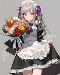 1girl,apron,blush,bouquet,bow,ciloranko,commentary_request,contender_(flowerful_maid)_(girls'_frontline),contender_(girls'_frontline),dress,english_commentary,english_text,flower,frilled_dress,frilled_skirt,frilled_sleeves,frills,girls'_frontline,grey_hair,hair_bow,holding,holding_bouquet,looking_at_viewer,maid,maid_apron,maid_headdress,mixed-language_commentary,multicolored_bow,official_alternate_costume,parted_lips,purple_eyes,simple_background,skirt,solo,two_side_up,white_background