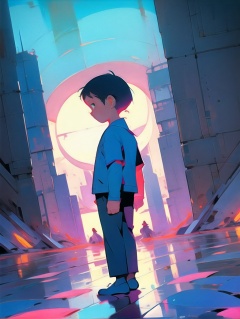 a boy stands in the middle of a city with a bright sunset behind him Acrylic