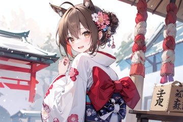 (masterpiece:1.2),best quality,PIXIV,1girl,animal ears,horse ears,tail,japanese clothes,solo,kimono,horse girl,horse tail,brown hair,hair ornament,looking at viewer,looking back,blush,from behind,open mouth,smile,hair flower,bangs,obi,own hands together,floral print,sash,wide sleeves,shrine,brown eyes,flower,white kimono,ahoge,hair between eyes,long sleeves,breath,alternate costume,donation box,hair bun,print kimono,single hair bun,yukata,<lora:happy new year_20240102112354-000018:0.8>,