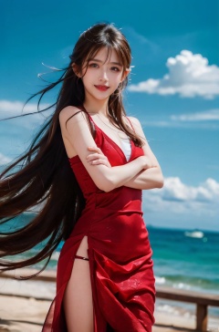 Blue Sky and White Cloud Beach,DSLR, (Good structure), HDR, UHD, 8K, A real person, Highly detailed, best quality, masterpiece, 1girl, realistic, Highly detailed, (EOS R8, 50mm, F1.2, 8K, RAW photo:1.2), ultra realistic 8k, ( solo, 1girl, , Wind, flowing hair, kind smile, , pose for picture, Dynamic pose, looking_at_viewer,  Detail,