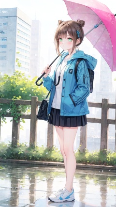 1girl, skirt, solo, umbrella, single hair bun, phone, holding, outdoors, hair bun, shoes, bag, jacket, shirt, transparent, sneakers, cellphone, white shirt, brown hair, holding phone, blush, standing, holding umbrella, reflection, belt, transparent umbrella, bangs, shoulder bag, white footwear, smartphone, open clothes, blue jacket, green eyes, fence, open jacket