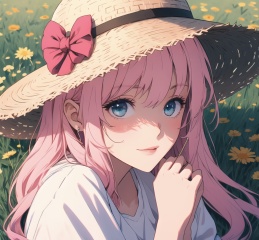 1girl,long pink hair,white clothes,homewear,girlband,8k,high definition,jorouyome-chan,fair_skin,perfect face,suneate,straw_hat,in a meadow,light and shadow,