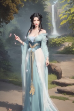 ultra realistic 8k cg,flawless,clean,masterpiece,professional artwork,famous artwork,perfect face,beautiful face,best quality,full_shot,absurdres,1girl,solo,hanfu,dress,standing,bare shoulders,facial mark,forehead mark,hair bun,hair rings,chinese clothes,sparkle,torogao,smile,makeup,red lips,breasts,large breasts,jewelry,earrings,hair ornament,(outdoors:1.4),water,waterfall,butterfly,flower,long hair,realistic,looking at viewer,high heels,<lora:shenfengJ_20240105120823-000004:0.7>,