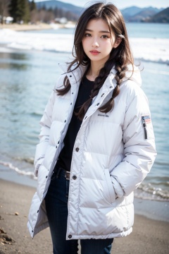 masterpiece,best quality,realistic,film grain,filming,1girl,20 years old, solo, long hair, looking at viewer, brown hair, blond hair, braid,brown eyes, standing, jacket, outdoors, pants, water, blurry, black eyes, coat, blurry background, beach, snow, hands in pockets, white coat, winter clothes, red lips, winter