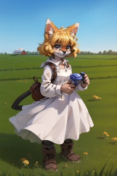 masterpiece, best quality, looking at viewer, soumao,servalcatfurry cat girl,blonde,farmer dress, farm,grass,wind <lora:servalcat:0.6>