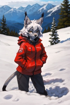 masterpiece, best quality,canadalynx, lynx, shanmao, sheli,looking at viewer, furry girl,white hair,long hair,red alpine jacket,snow,outdoors<lora:Lynx:0.5>