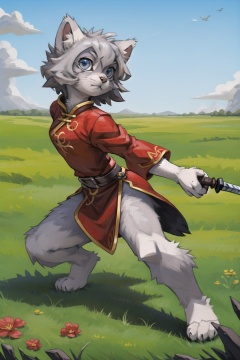 masterpiece, best quality,manul,tusun,looking at viewer, dynamic pose, furry girl,kid,grey hair,chinese clothes, outdoors,grass,prairie,holding sword,  <lora:兔狲:0.5>