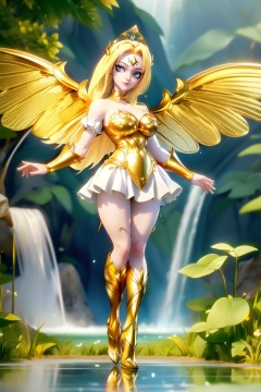 (8k, RAW photo, best quality, masterpiece:1.2),(super realistic, photo-realistic:1.3),ultra-detailed,extremely detailed cg 8k wallpaper,hatching (texture),skin gloss,light persona,(crystalstexture skin:1.2),(extremely delicate and beautiful),1girl,solo,pov,(full body:1.7),Sharp eyes,angel,feathered wings,gold armor,mechanical wings,spread wings,yellow wings,frown,waterfall,butterfly,reflection,tree,(full shot),(breasts, medium breasts, cleavage:1.2),looking_at_viewer,ts-hd,tsc-hd,<lora:1025ts-000018:0.8>,