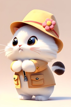 Pixar style,cat,no humans,white cat,hat,animal,zipper,solo,animal focus,simple background,whiskers,clothed animal,pocket,fluffy,