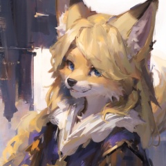 absurdres, highres, ultra detailed, masterpiece, sharp shading,wind,solo,perfect lighting,portrait, fox furry girl,(kid:1.2),blonde,high detail fur,fur paws ,fantasy,singer outfit, hair over one eye, looking at viewer, <lora:GoodHands-beta2:0.7> <lora:Oilpainting:0.3>l <lora:bouguereau:0.3> Furry Girl