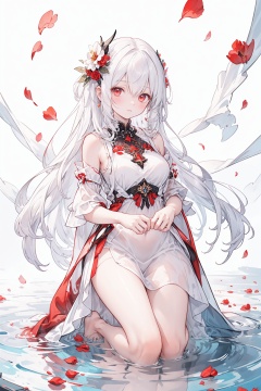 1girl, red eyes, white long translucent night gown, expressionless, (white hair), hair cover one eye, long hair, red hair flower, kneeling on lake, blood, (plenty of red petals:1.35), (white background:1.5), (English text), Highest picture quality, masterpiece, exquisite CG, exquisite and complicated hair accessories, big watery eyes, highlights, natural light, Super realistic, cinematic lighting texture, absolutely beautiful,(Show whole body), (all body),