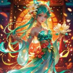 dunhuang,1girl, solo, long hair, looking at viewer, bangs, hair ornament, dress, holding, bare shoulders, jewelry, upper body, flower, earrings, parted lips, hair flower, necklace, blurry, bracelet, aqua eyes, lips, petals, eyelashes, strapless, aqua hair, floating hair, depth of field, blurry background, glowing, white flower, light particles, armlet, backlighting, holding flower, hatsune miku
