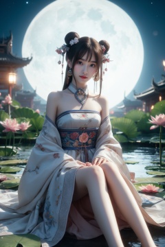 1girl, moon, jewelry, hair bun, solo, long hair, night, sitting, hair ornament, flower, lily pad, double bun, full moon, brown hair, barefoot, sky, lotus, water, earrings, chinese clothes, looking at viewer, night sky, ring, bare shoulders, sash, black hair<lora:嫣月楼:0.7>