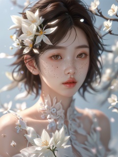 (\fan hua\),1girl, solo, parted lips, realistic, lips, brown hair, white flower, hair ornament, looking at viewer, short hair, freckles, black hair, portrait, hair flower, brown eyes, upper body, blurry