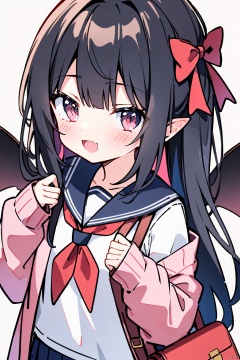 (masterpiece), (best quality),(illustration), ((chinese colorful ink)), solo, 1girl, skirt, pleated skirt, virtual youtuber, sleeves past wrists, wings, red wings, sailor collar, jacket, multicolored hair, white background, smile, shirt, :d, red eyes, makaino ririmu, open clothes, white shirt, pink jacket, blue skirt, hair bow, open jacket, sleeves past fingers, open mouth, long hair, black bow, bow, blue sailor collar, neckerchief, red neckerchief, simple background, looking at viewer, long sleeves, demon wings, blush, serafuku, fang, shoulder bag, heart, bag, very long hair, bangs, pointy ears, two-tone hair