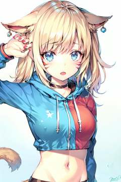 1girl, solo, tail, animal ears, facial mark, cat tail, shoulder cutout, cat ears, blonde hair, navel, looking at viewer, long hair, clothing cutout, crop top, twintails, blue eyes, midriff, choker, fang, miqo'te, jewelry, upper body, nail polish, long sleeves, open mouth, signature, cat girl, breasts, :o, hair ornament, red nails, stomach, hand up, bare shoulders, gradient, gradient background, hood, earrings, medium breasts, slit pupils, white background, whisker markings, arm up, star (symbol), blush, drawstring, bangs, tail raised, shirt, hoodie, crop top overhang
