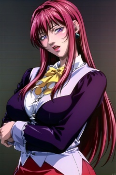 Hiroko, 1girl, solo, earrings, jewelry, long hair, lipstick, red hair, crossed arms, makeup, breasts, large breasts, black background, formal, skirt, bow, blue eyes, open mouth, simple background, suit, purple eyes, looking at viewer,nice hands, Hiroko