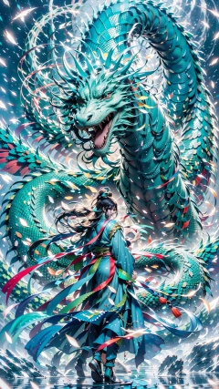 1 Girl, Ancient Chinese Hanfu, White Hair, Long Sleeve, Dynamic Pose, Ancient Chinese Architecture, Giant Green Dragon, Energy Storm, Watching Audience, Female Focus, Outdoors, Standing, Green Dragon
