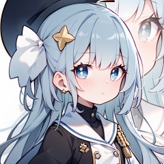 close-up,face focus,1petite loli,dark blue hair,long hair,(blue eyes),portrait,black coat,white uniform ,white skirt,((star hairpin)),star,closed month,happy, chibi,surrealistic, close-up, eyesseye