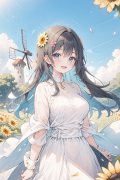 1girl, bangs, black_hair, blue_sky, blush, bouquet, breasts, city, cityscape, cloud, cloudy_sky, collarbone, confetti, daisy, day, falling_petals, fence, ferris_wheel, field, flower, flower_field, hair_ornament, hairclip, holding, holding_flower, house, jacket, leaves_in_wind, long_hair, long_sleeves, looking_at_viewer, open_clothes, open_jacket, outdoors, petals, rose_petals, sky, skyline, skyscraper, smile, solo, sunflower, tower, upper_body, wind, windmill, yellow_flower, (wide shot, mid shot, panorama), blurry,Nebula, flowing skirts,(smoke),Giant flowers,, chang, Light-electric style, 30710