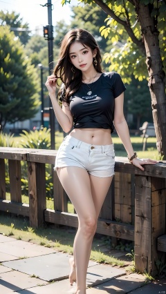 1girl,arm support,barefoot,breasts,brown eyes,brown hair,earrings,feet,jewelry,leaf,leg up,long hair,looking at viewer,nail polish,nature,Girl's posture,Upper body,Leaning against a wooden railing,navel,outdoors,plant,potted plant,short shorts,shorts,smile,solo,standing,standing on one leg,toenail polish,toenails,toes,tree,white shorts