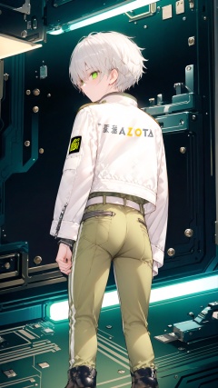 阿索, (masterpiece), (best quality), 1 boy, over 20 years old, outgoing, sunny and handsome, Green pants, black boots, white jacket, Stand up collar jacket, (sci-fi style), Silver short hair, white belt, Green pupils, 1boy, male focus, pants, solo, white hair, green eyes, jacket, from behind, Reality,science fiction,light-emitting circuit boards,chips,high-tech, The logo on the clothing is Zotac,<lora:阿索SD1.5:1>,