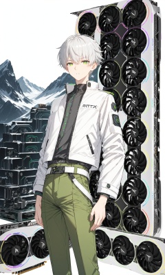 阿索, (masterpiece), (best quality),Science fiction, RGB, RTX, many graphics cards, graphics cards piled up in mountains, graphics card fans, green fluorescent tubes, boys holding up a graphics card with both hands, 1 boy, over 20 years old, outgoing, sunny and handsome, Green pants,  white jacket, Stand up collar jacket, (sci-fi style), Silver short hair, white belt, Green pupils, solo,