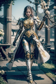 hjyjiazhourbt,1girl,lush flower garden,(((mecha legs))),(((mecha arm))),hands up,walking,mecha body,A cuirass with a Chinese pattern,(flower and branch  background:1.3),biomechanical,(looking at viewer),(((dynamic pose))),dynamic angle,(chinese armor:1.4),gold. hi - tech synthetic bio ethereal metal and black titanium material,masterpiece,best quality,(highly detailed),gold hair,(full body:1.3),day light,((bright light)),wide angle,sleek,studio light,<lora:hjyjiazhouRBTcropface-000002:0.8>,slender,