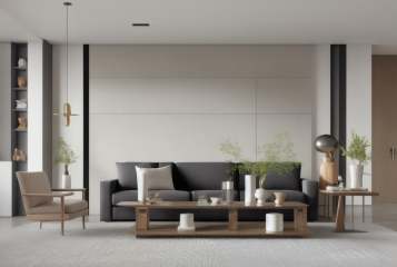 by Joanna Gaines,living room,sofa,Television,TV Stand,Coffee Table,Side Table,Rug,Floor Lamp,Pendant Light,Bookshelf,Curtains,Vase,Decorative objects,Door,Wall Decorations,Furniture, Chair, Throw Pillow, Windowsill, Tableware, Tablecloth, Books, Flowers,Candle Holders,Pillow,Natural lighting,Neoclassical,Neutral Color Scheme, side-view, best quality, masterpiece, high resolution, extremely detailed