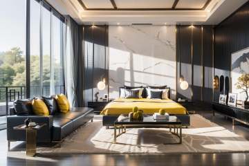 Lao Chen Jingdian, bed, scenery, no humans, tree, window, table, book,interior design, living room, masterpiece,best quality,unreal engine 5 rendering,movie light,movie lens,movie special effects,detailed details,HDR,UHD,8K,CG wallpaper,Modern Luxury Art Colors, Yellow Classic