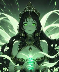 Hindu goddess, (green theme), ((glowing)), 1girl, solo, looking at viewer, upper body,<lora:Green-Nostalgia:1>, drill hair, willowy body, oversized breasts, old-world European street with cobblestones, (masterpiece, best quality, detailed:1.3), alluring, (vignette:1.3)