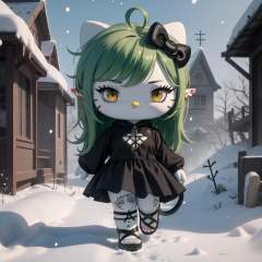hello_kitty, gavial, 1girl, green hair, yellow eyes, black-framed eyewear, long sleeves, goth, black dress, snow, snowing, whiskers, tail, full body, looking at viewer, solo, <lora:hello_kitty-09:1>, <lora:Gavial-04:1>