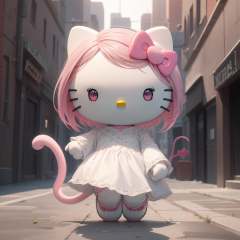 hello_kitty, 1girl, pink hair, pink eyes, black-framed eyewear, long sleeves, white dress, whiskers, tail, full body, looking at viewer, solo, <lora:hello_kitty-09:1>