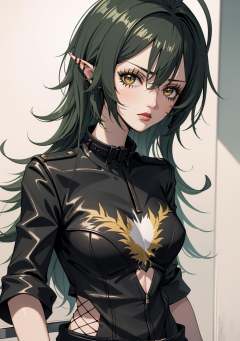 nana, gavial, 1girl, green hair, yellow eyes, makeup, eye liner, upper body, looking at viewer, solo, <lora:nana-10:1>, <lora:Gavial-04:1>, black leather jacket, fishnet shirt, ripped jeans, and platform boots