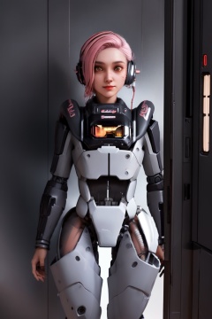<lora:lida_15_v4:1:lbw=KEEPCHAR>,lida,1girl,solo,looking at viewer,cowboy shot,standing,realistic,cyborg,robot joints,power armor,fingerless gloves,a female character with pink hair,the character has a headset with a microphone attached to her ear,the suit is predominantly gray with black accents and it appears to be made of a metallic material,she is standing in a dimly lit room with a metallic door in the background,the overall ambiance of the image suggests a sci-fi or cyberpunk theme,female character,futuristic armored suit,metallic material,headset with microphone,dimly lit room,metallic door,