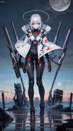 jiqi, art style, robot, mecha, science fiction, no humans, weapon, humanoid robot, holding gun, solo, holding weapon, gun, holding, cable, sky, glowing, moon, extra eyes, looking ahead, smoke, wire