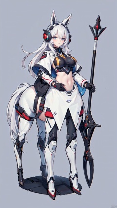 jiqi, art style, 1girl, holding polearm, polearm, solo, holding, weapon, full body, holding weapon, breasts, sidelocks, taur, standing, looking at viewer, long hair, bangs, large breasts, science fiction, white hair, centaur, animal ears, spear, monster girl, tail, multiple legs, headgear, lance, grey background, blunt bangs, robot joints, horse ears, covered navel, mechanical legs, closed mouth, floating hair, gloves, mecha musume, capelet, horse tail, white jacket, grey eyes, very long hair, hair between eyes, bodysuit, android, black gloves, mechanical ears