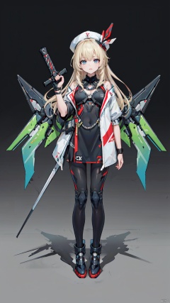 jiqi, art style, solo, mecha musume, weapon, sword, blonde hair, 1girl, gradient, mechanical wings, gradient background, wings, holding, dual wielding, grey background, looking at viewer, hat, science fiction, full body, holding weapon, floating