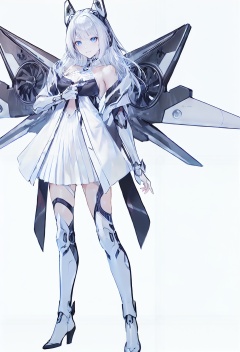 8k,best quality,masterpiece,(ultra-detailed:1.1),(high detailed skin),(full body:1.3),white background,standing,looking at viewer,(solo:1.4),hand on hip,<lora:tianqi-v100:0.8>,white dress,tianqi,white mechanical wings,blue eyes,long hair,white hair,breasts,bare shoulders,animal ears,boots,bangs,(white background, simple background:1.6),(beautiful_face),((intricate_detail)),clear face,((finely_detailed)),fine_fabric_emphasis,((glossy)),full_shot,