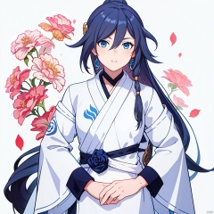 fu hua,white skin,messy hair,yin yang,smile,braided ponytail,braid,blue eyes,1girl,hair between eyes,ponytail,multicolored hair,streaked hair,long hair,bangs, Anime