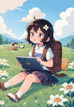 (Masterpiece), (Best Quality), Children's Illustration, Line Stroke, 1 cute girl, blue pupils, curly brown hair, holding a book, backpack, tablet, sitting on the grass, looking at the sky, clouds, donuts, white flowers, detailed details,