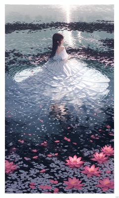 1girl, long hair, black hair, dress, flower, barefoot, signature, water, white dress, petals, border, plant, white border, reflection, branch, ripples