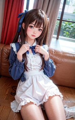 (cowboy shot,very long hair,4349:1),1girl, solo, long_hair, fishnets, looking_at_viewer, brown_hair, bangs, very_long_hair, ribbon, long_sleeves, couch, hair_ribbon, window, blush, dress, pantyhose, bow, indoors, frills, two_side_up, curtains, dutch_angle